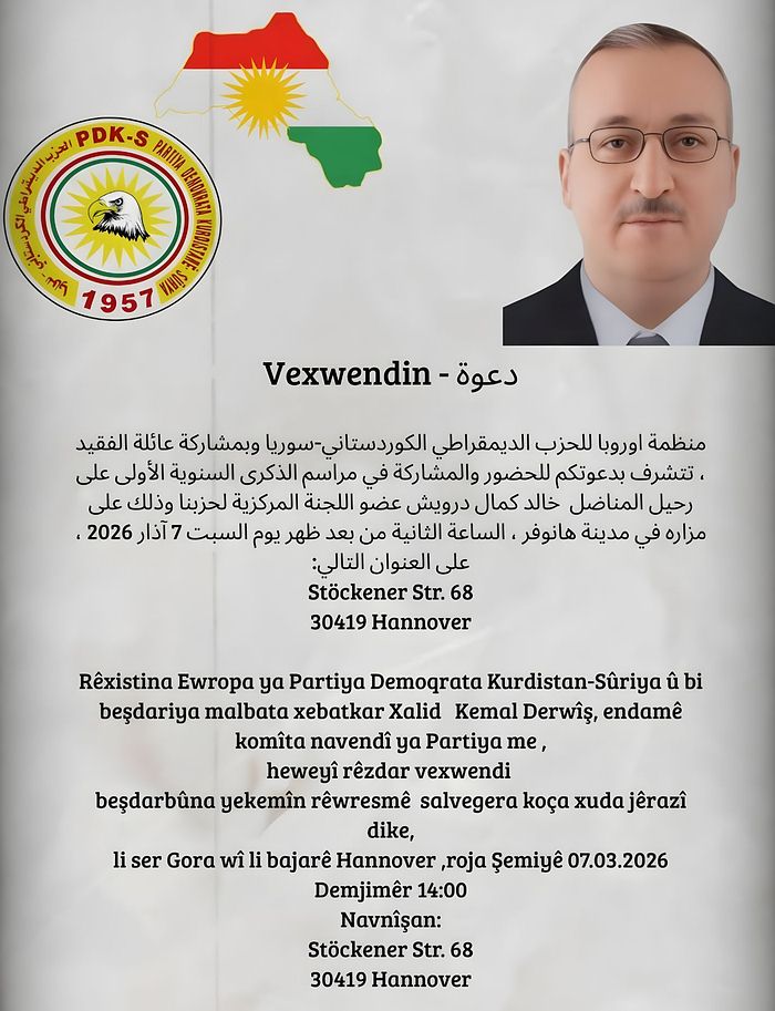 Rêxistina Ewropa ya Partiya Demoqrata Kurdistan-Sûrîya û bi beşdariya malbata xebatkar Xalid Kemal Derwîş, endamê komîta navendî ya Partiya me, heweyî rêzdar vexwendî beşdarbûna yekemîn rêwresmê salvegera koça xuda jê razî